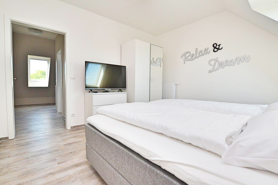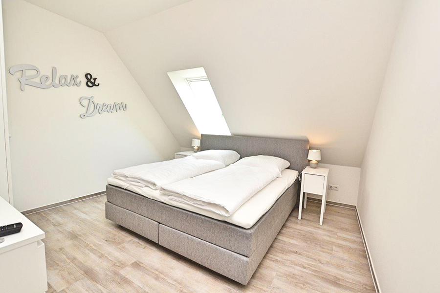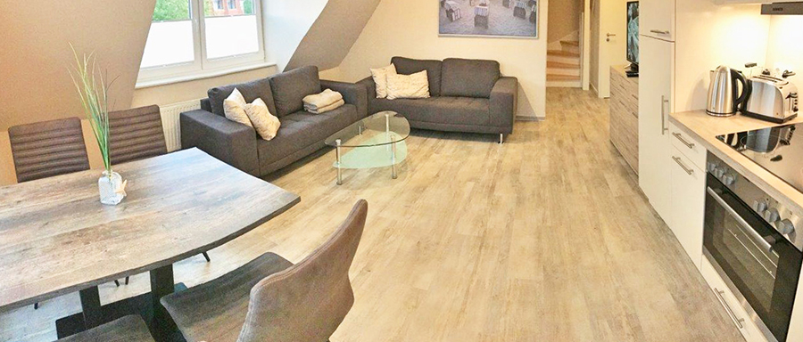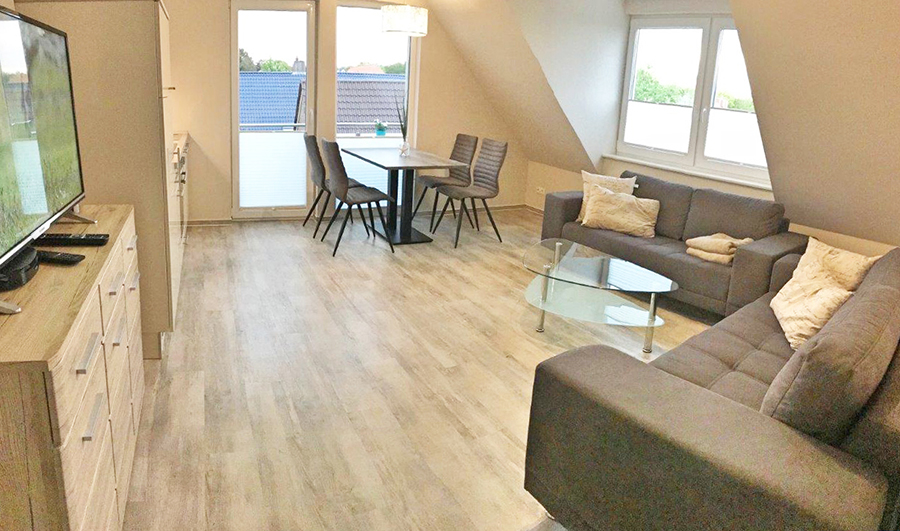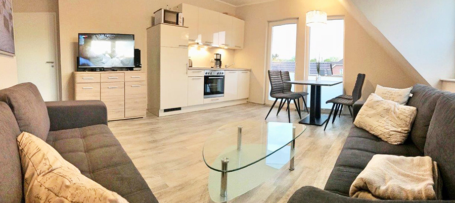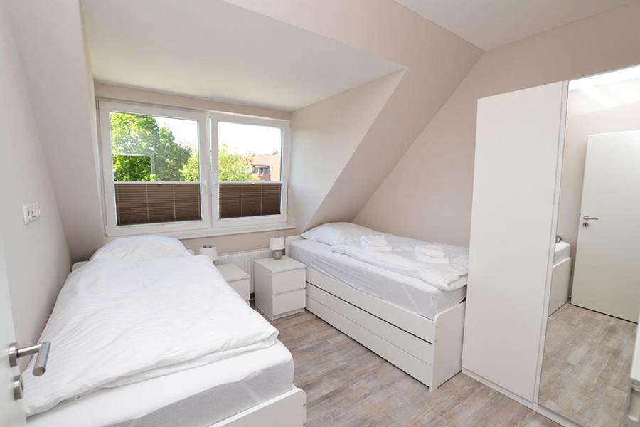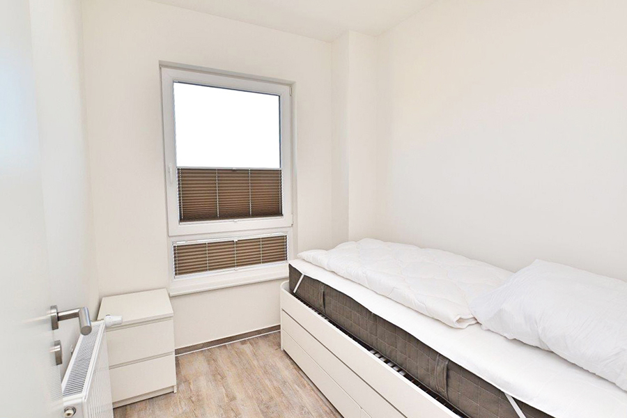 In der zweiten Etage liegend, erwarten Sie ein Wohn/Esszimmer mit offener Küche, ein Schlafzimmer mit Doppelbetten, ein Schlafzimmer mit zwei Einzelbetten, ein Schlafzimmer mit einem Einzelbett, ein Duschbad sowie ein kleiner Abstellraum.
